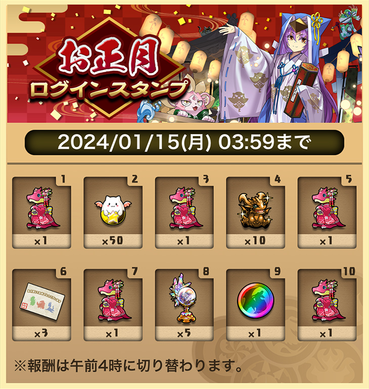 また、今回もログインスタンプが開催。正月のめでたさからか、なんと5回もガチャを引くことが出来ます!